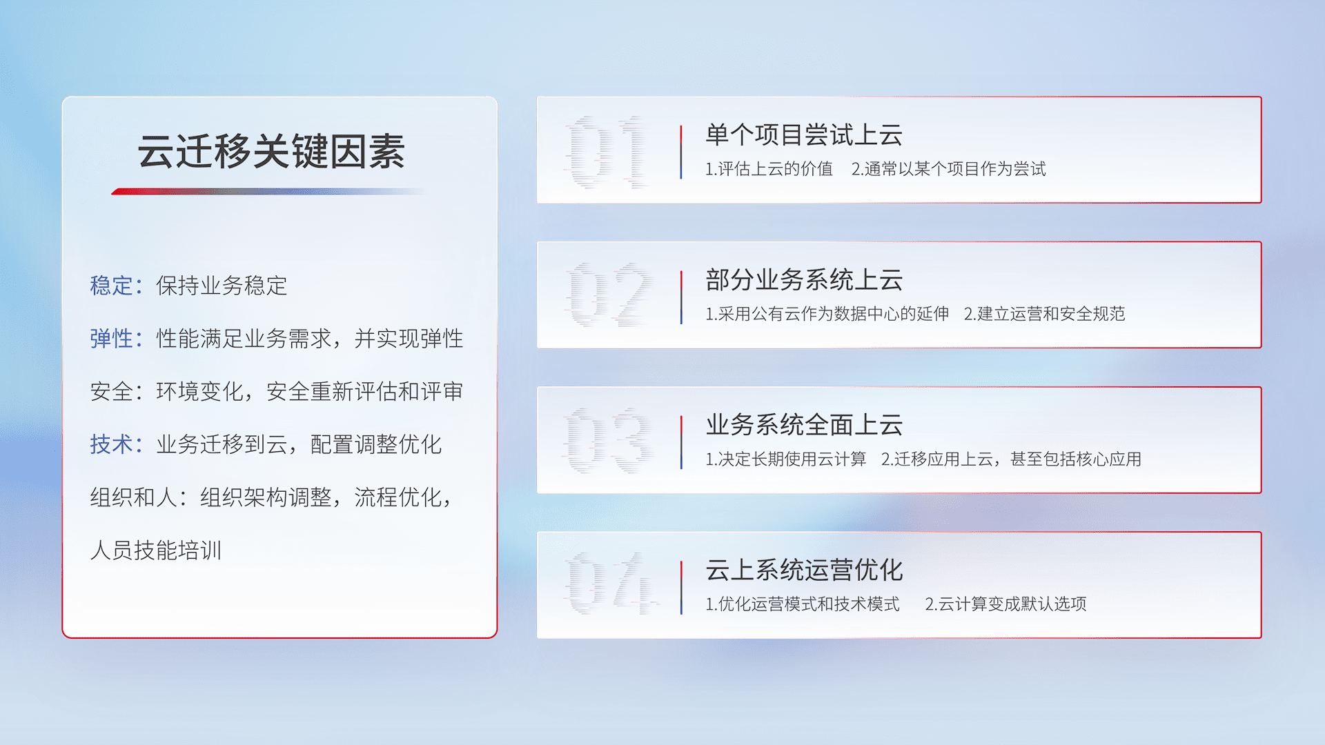 结合实际业务,,,从规划设计、、、、云平台选型、、、、云原生改造、、、数据迁移、、、、集成交付,,,,迁移全过程为客户识别最佳上云路径,,,,做好风险识别管理,,,,设计网络架构、、、身份权限、、安全审计合规、、、操作审计、、、日志审计、、、监控告警策略、、、、多站点容灾设计等,,,对云上基础设施进行整体规划,,提升IT治理水平,,,,以满足弹性、、高可用、、高性能的需求。。。